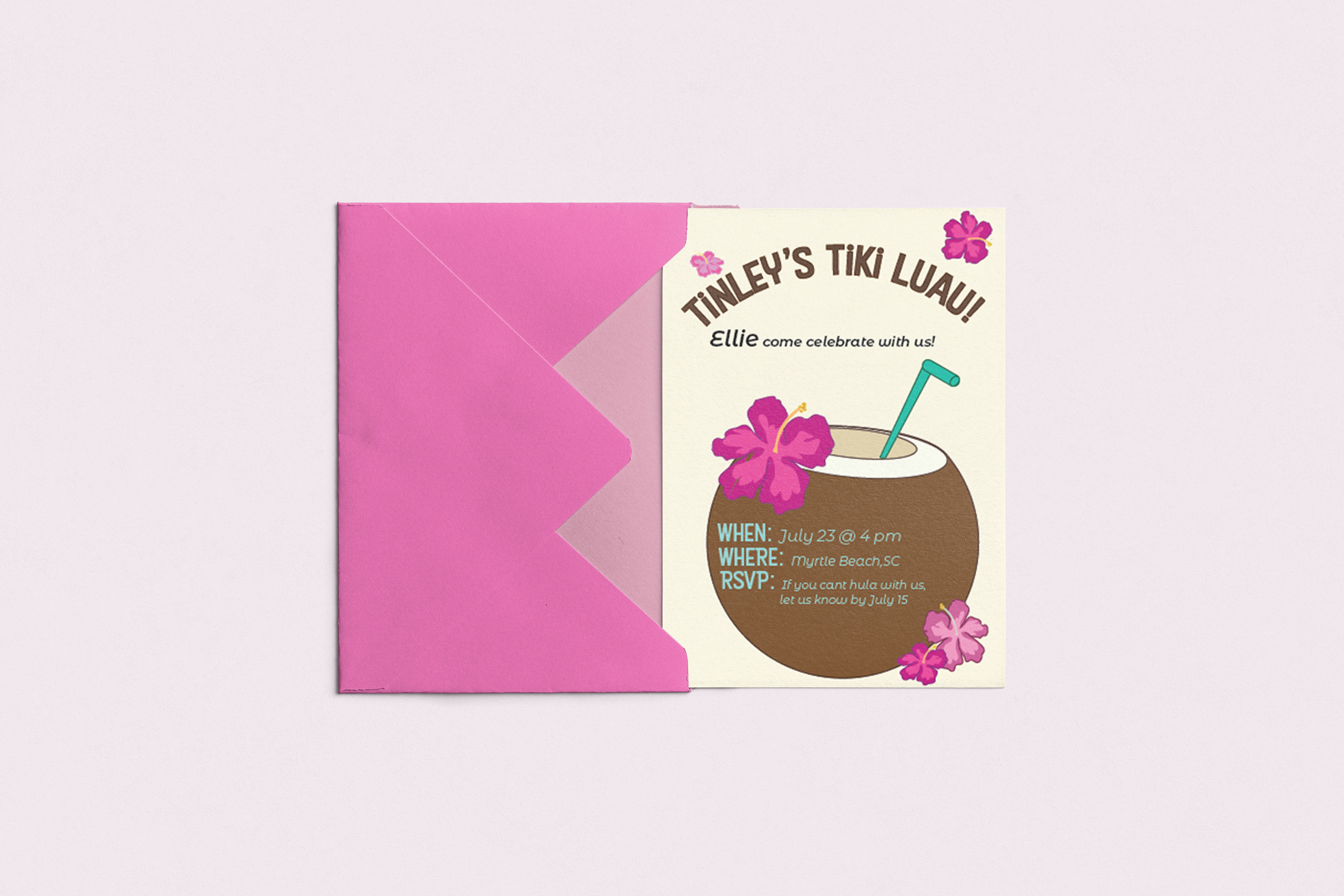 For this project I was tasked with creating a birthday invitation. I chose the theme “Tiki Luau,” featuring a coconut drink with hibiscus flowers and a straw as the central design element. My goal was to create a playful, tropical feel using bright, sunny colors and simple shapes that instantly convey the festive theme. The coconut was chosen for its strong association with island celebrations, while the floral accents add extra vibrancy. From this project I learned how a few well-chosen design elements can clearly communicate a theme. I enjoyed designing something cheerful, fun, and perfect for a celebration.