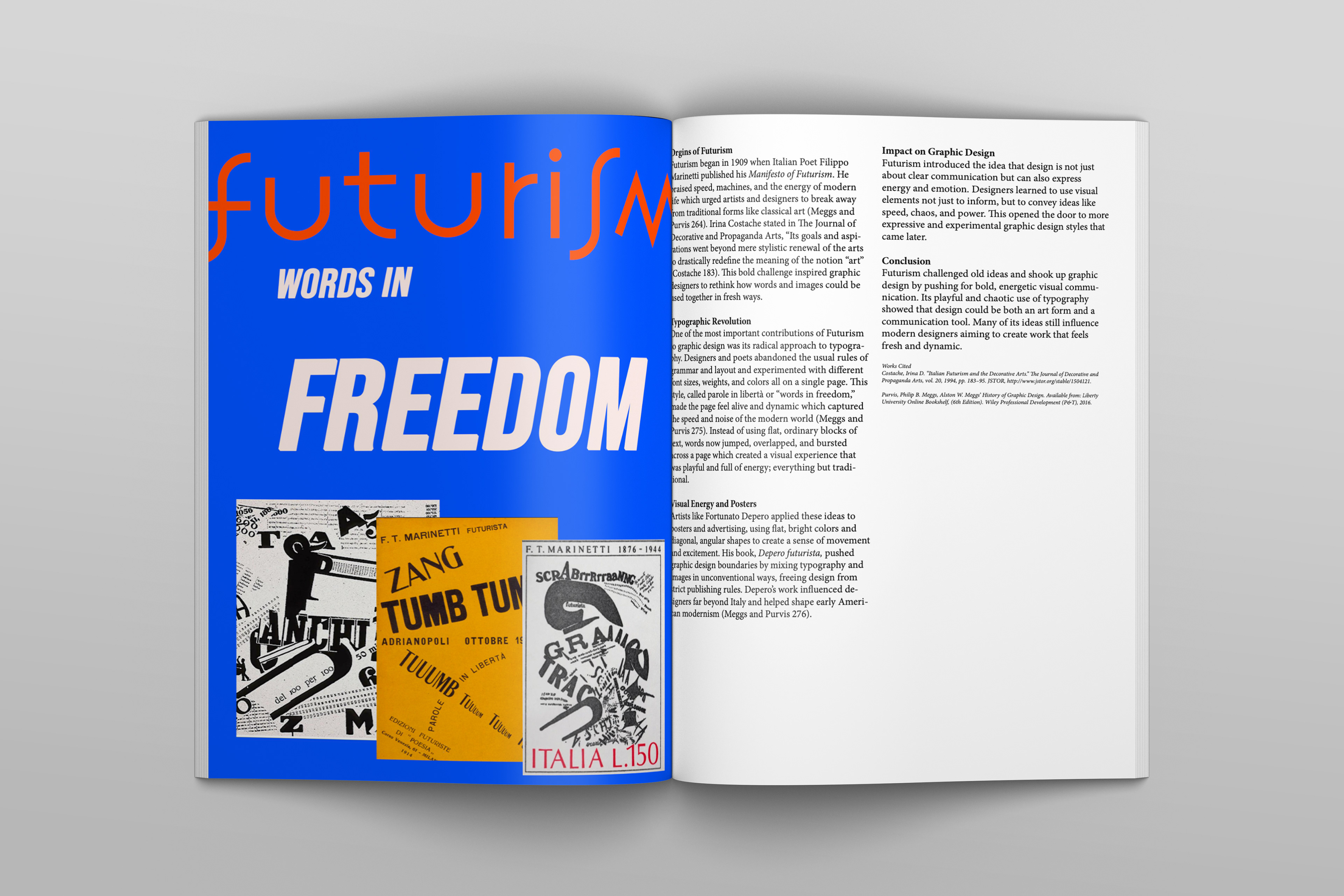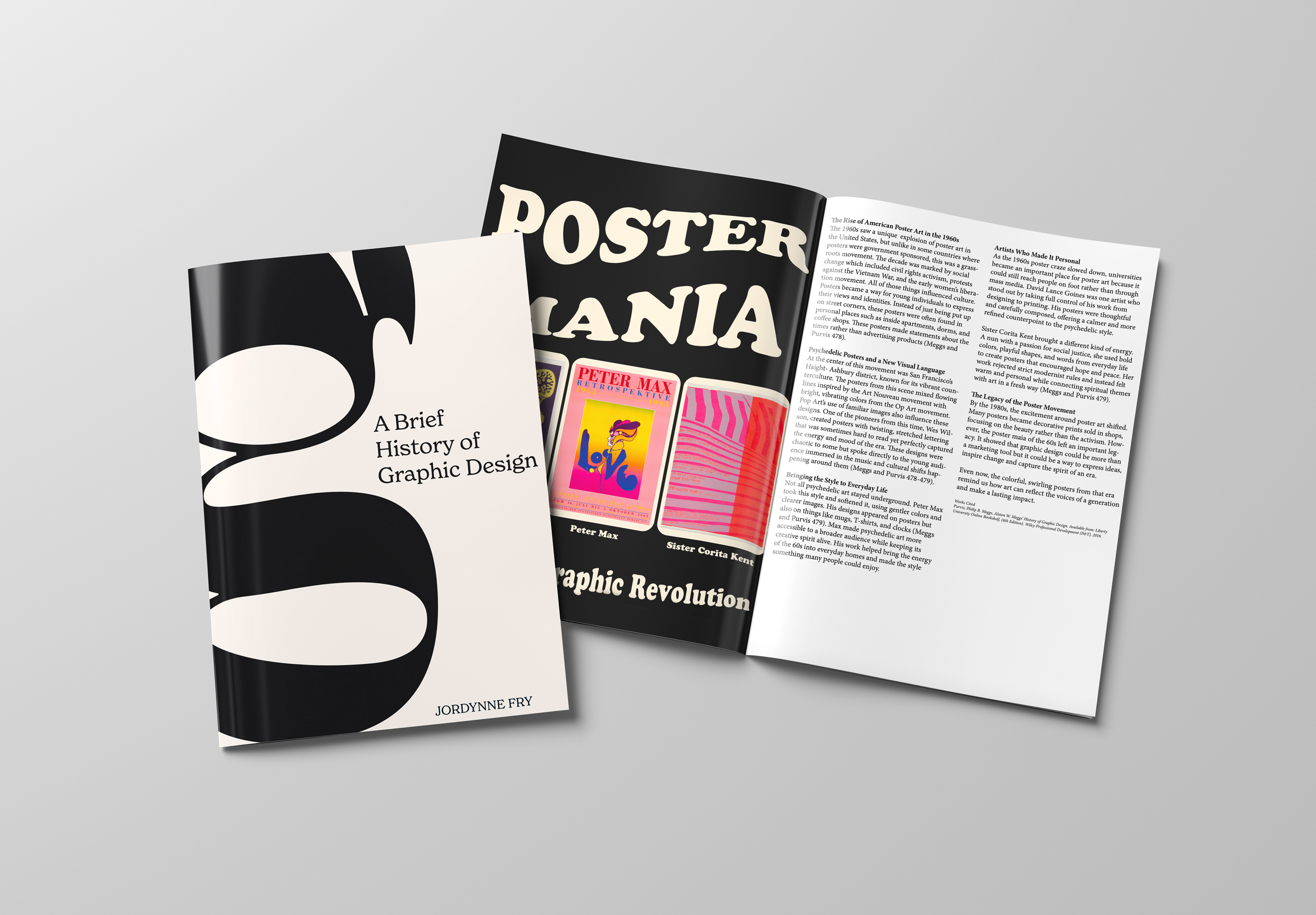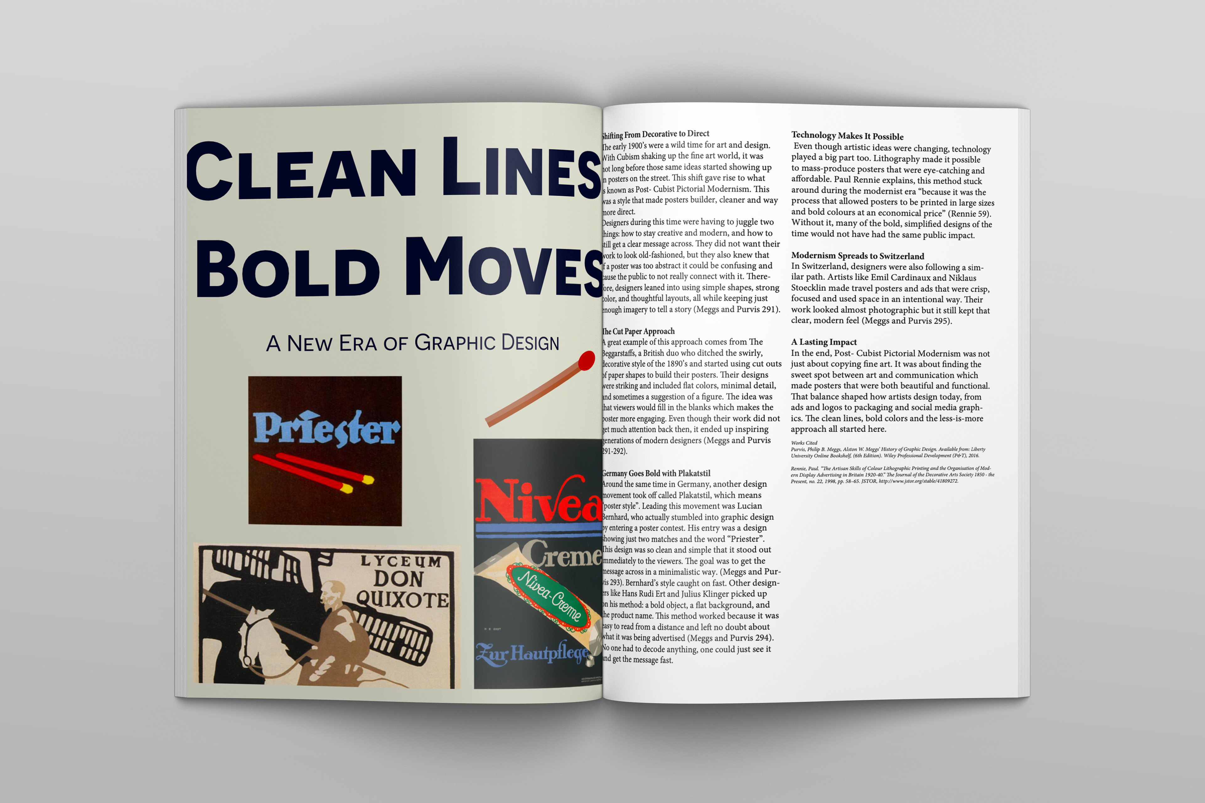 This booklet was created for an 8-week History of Graphic Design course, documenting weekly explorations of key design movements, artists, and ideas from the readings. Each two-page spread pairs a research-based essay with a digital composition, translating historical concepts into visual layouts. Over the course, my designs became more refined, with stronger hierarchy, typography, and visual consistency. The final booklet brings these spreads together into a cohesive publication, reflecting both my understanding of design history and growth in layout and composition.