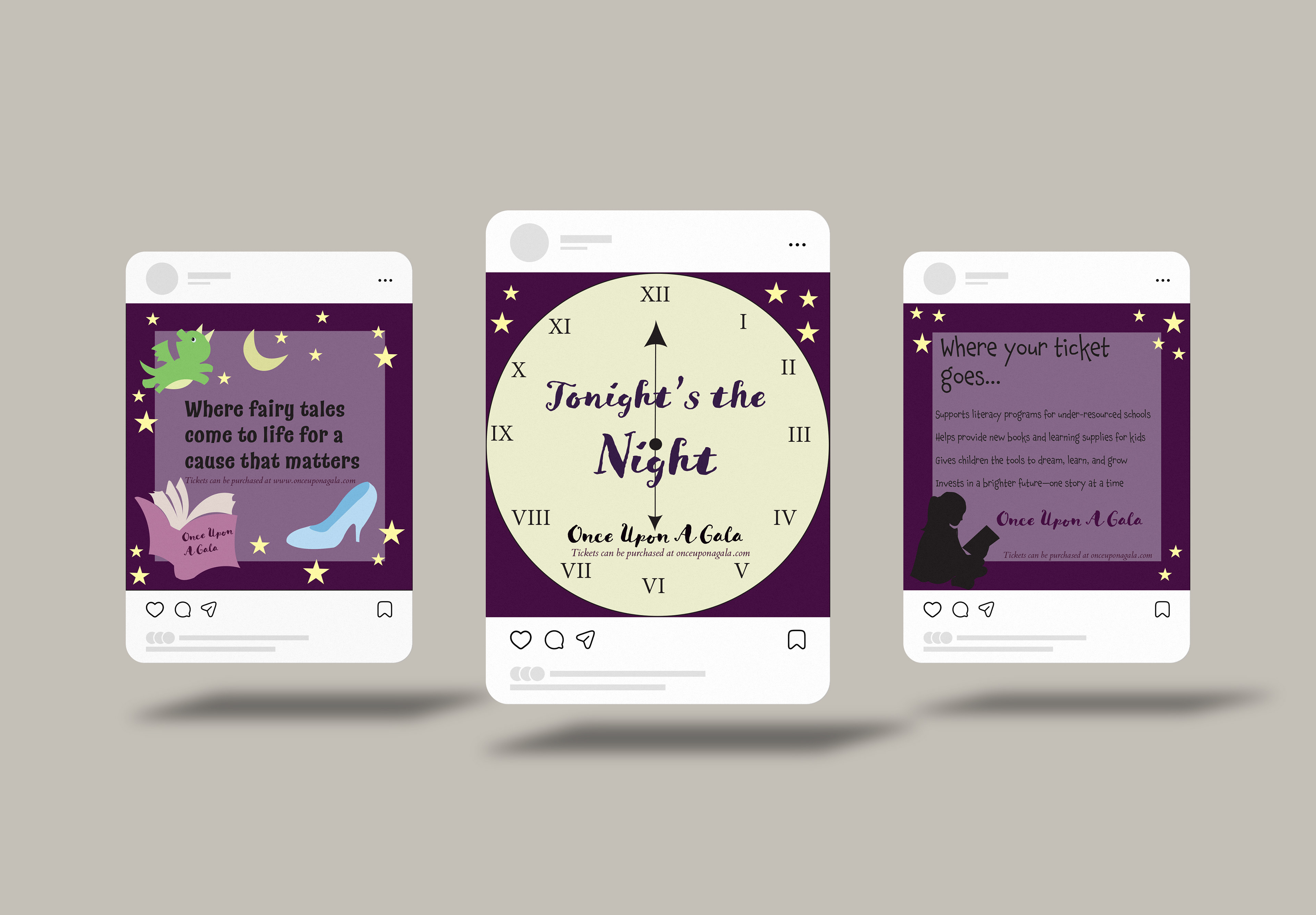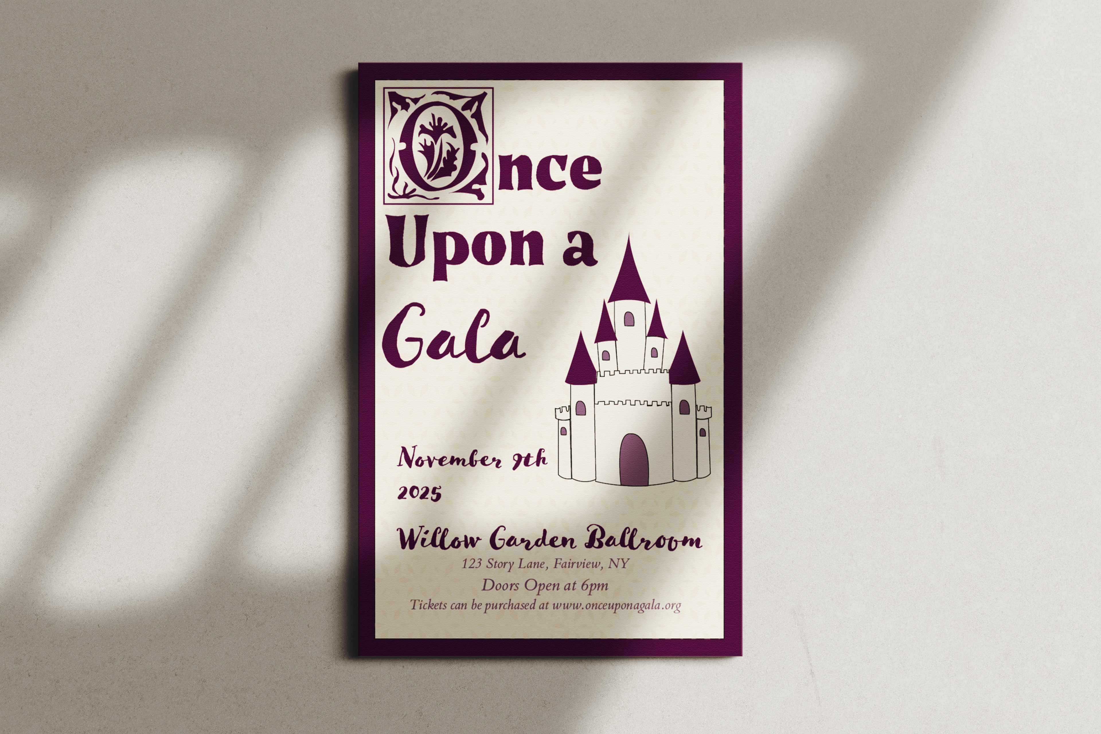 For this project, I was tasked with creating both a poster and a series of social media posts for a fundraising event. The chosen theme, Once Upon a Gala, was inspired by classic fairy tales and aimed to blend elegance with a whimsical, storybook charm. The event’s purpose to support children’s literacy, especially in underserved communities, informed the overall tone and imagery, as I wanted the designs to feel magical while still highlighting the meaningful cause. I began the project by sketching out initial concepts and layouts to explore imagery, hierarchy, and composition. From there, I moved into Adobe Illustrator, where I created all of the illustrations as vector graphics. The final designs feature illuminated-style lettering, a detailed castle illustration, dragon, glass slipper and golden star motifs to immediately convey a fairy-tale atmosphere. A soft purple color palette paired with warm gold accents helped create an inviting and enchanting mood, while cohesive typography and layout ensured clarity across both print and digital formats. Each social media post was designed with a specific purpose in mind, ranging from sharing inspirational quotes to promoting ticket sales, while maintaining consistent visuals for strong brand recognition. Overall, my design choices were guided by the goal of immersing viewers in a magical narrative at first glance while still providing clear and accessible event information. This project allowed me to combine imaginative storytelling with purposeful design, resulting in visuals that both captivate and inform.